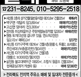 전주 금암동부동산- 에이스공인중개사[전주원룸][전주상가][전주모텔][전주상가주택][전주땅]매매전문 전주 금암동부동산- 에이스공인중개사[전주원룸][전주상가][전주모텔][전주상가주택][전주땅]매매전문 목차 1. 전주 금암동 추천 부동산 2. 전주 에이스공인중개사 주소 3. 전주 에이스부동산 매물 1. 전주 금암동 추천 부동산전부 덕진구 금암동에 소재한에이스공인중개사 안내입니다. 전주벼룩시장에 박스광고를 게재중인덕진구 소재 부동산으로전주원룸, 전주상가, 전주모텔전주상가주택, 전주토지, 전주땅을전문적으로 취급하고 있는 부동산입니다. 먼저 간단하게 위치부터 알아보겠습니다. 2. 전주 에이스공인중개사 주소전주 에이스공인중개사 주소신주소 : 전라북도 전주시 덕진구 가리내로 16 201호구주소 : 전라북도 덕진구 금암동 461-14 네이버지도 에이스공인 약도 다음지도상 에이스공인 약도 3. 전주 에이스.. 더보기 전주 서신동부동산- 열매공인중개사[전주토지][전주땅][전주촌집][전주전원주택]전문/전주벼룩시장 전주 서신동부동산- 열매공인중개사[전주토지][전주땅][전주촌집][전주전원주택]전문/ 전주벼룩시장 전라북동 전주시 완산구 서산동에 소재한열매공인중개사 소개입니다. 열매공인중개사는전주벼룩시장에 박스광고를 게재중인업체로 전주전역의토지, 상가, 전원주택, 촌집, 주택, 원룸매매 및 임대를 전문적으로 취급하고 있는 전주부동산입니다. 전주 열매부동산 네이버 약도 전주부동산- 열매공인중개사 다음 약도 전주 열매공인중개사 입구 간판 전주벼룩시장 신문에 게재된 박스 문안 내용 ▲ 전주벼룩시장 보시고 전화 하셨다고 하면 더욱 더 친절히 상담해 드립니다. 전주벼룩시장에 게재중인 박스 문안 내용 1. 서신동 2층의 상가건물 매매 일반음식점 대213.8㎡ 건물225㎡ 매4억 2. 백구면 석담리 답3,894㎡ 매1억3천만 3. .. 더보기 전주 완산구 효자동부동산-올레공인중개사[전주전원주택][전주촌집][전주원룸]매매 임대 전문 전주 완산구 효자동부동산-올레공인중개사[전주전원주택][전주촌집][전주원룸]매매 임대 전문 전라북도 전주시 완산구 효자동에 소재한올레공인중개사 소개입니다. 전주올레부동산은완산구 효자동에 소재한 부동산으로전주 벼룩시장에 박스를게재중인 부동산입니다. 전주 올레공인중개사 주소 및 약도신주소 : 전라북도 전주시 완산구 우전로 321구주소 : 전라북도 전주시 완산구 효자동3가 1642-5 네이버 지도상 올레공인 약도 전주벼룩시장에 게재중인 박스 문안 내용 ▲ 전주벼룩시장 보시고 전화 하셨다고 하면 더욱더 친절히 상담해 드립니다. 박스 문안 내용 1.평화동 원룸매매 A동, B동 전부12억2천, 실투자4억평화동 사거리 뱅뱅 뒤쪽(2개동) 각층 231㎡(건416㎡ ) 2.군산모텔 초급매객실44실 매매가11억5천 대출9억.. 더보기 이전 1 2 3 4 5 다음