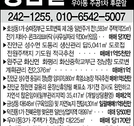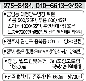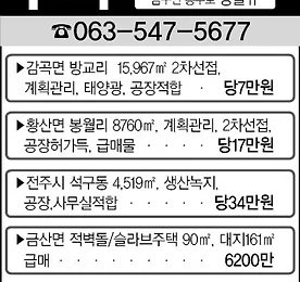 전주부동산- 황희부동산1번지[전주땅][전주촌집][전주벼룩시장] 전주부동산- 황희부동산1번지 전라북도 전주시 토지매매를 전문적으로 취급하는 전주 토지매매 전문 부동산입니다. 전주벼룩시장에 꾸준히 박스를 게재중인 업체로 아래는 박스 게재문안입니다. 박스 문안 내용 1. 전주토지매매 봉동읍 성덕리 담1785㎡ 투자적합... 당22만2. 김제 토지매매 : 김제 백구면 석담리 답3966㎡ ... 당12만3. 전주토지매매 : 화산면 화월리 6945㎡ 전기 지하수 시설됨 ... 당4만4. 전주 화산면 토지매매 : 종리 답5570㎡ ...당13만5. 전주 호성동 토지매매 : 에코시티부근 대879㎡ ...당210만6. 전주시 상관면 토지매매 : 죽림대로변 계획관리지역 답5533㎡ 답2707㎡ 창고, 공장, 모텔, 물류창ㄹ고 투자적합 ... 당35만7. 전주시 화산면 주택매매 : 춘.. 더보기